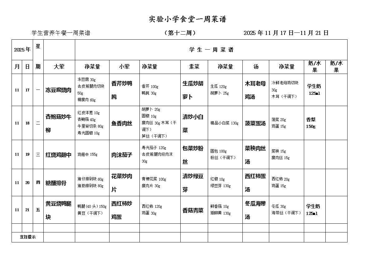2025-2026学年度第一学期第十二周师生一周菜谱