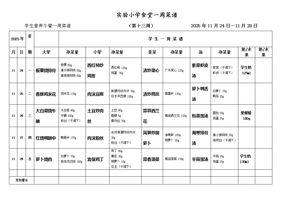 2025-2026学年度第一学期第十三周师生一周菜谱