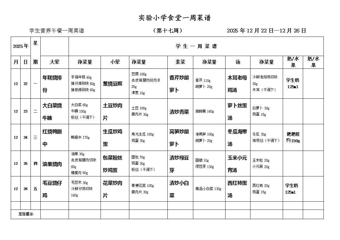 2025-2026学年度第一学期第十七周师生一周菜谱