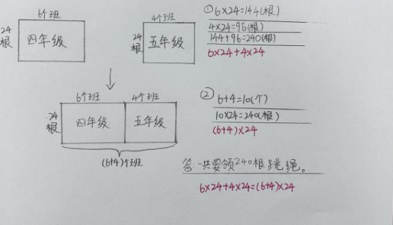 苏教版四年级“运算定律”是重点内容,包括加法交换律、结合律,乘法交换律、结合律与分配律。以往教学中,学生多靠死记公式解题,遇到变式题就容易混淆,无法灵活运用。借鉴书中“具象化理解”理念,我认为可以用画图方式帮学生拆解定律本质,让知识变易懂、好记。教学“乘法分配律”时,教材例题为“四年级有6个班,五年级有4个班,每个班领24根跳绳,一共要领多少根跳绳?”,常规教学多直接推导公式“(a+b)×c=a×c+b×c”,学生难以理解逻辑。在教学中我们可以引导学生用画图表达题意:先画两个长方形,一个代表四年级,长为6个班、宽为24根,面积表示四年级跳绳总数;另一个代表五年级,长为4个班、宽为24根,面积表示五年级跳绳总数;再将两个长方形拼在一起,形成一个长为“(6+4)个班”、宽为24根的大长方形,面积就是总跳绳数。学生通过观察图形,能直观看到“大长方形面积=两个小长方形面积之和”,即“(6+4)×24=6×24+4×24”,进而理解乘法分配律的核心逻辑。
