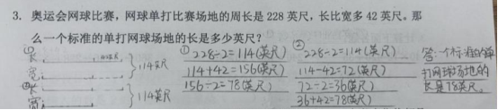 在教学两步计算的解决问题时,练习中遇到“长方形的周长为228英尺,长比宽多42英尺,长和宽各是多少英尺?”,部分学生分不清“和差关系”,解题时思路混乱。我引导学生用线段图梳理:先画一条短线段代表宽,再画一条比它长一小段的线段代表长,长比宽多的部分标注“多42英尺”,两条线段总长标注“114英尺”。学生通过线段图能快速发现“总和减去42英尺,就是两条等长线段的长度,即两条宽的长度”,先算出长方形的宽“(114-42)÷2=36英尺”,再算出长“36+42=78英尺”。后续遇到“果园里苹果树和梨树共360棵,苹果树棵数是梨树的2倍,两种树各有多少棵?”这类和倍关系和解决问题,同样用线段图辅助,让学生直观看到“总棵数对应3份梨树棵数”,轻松理清解题逻辑。
