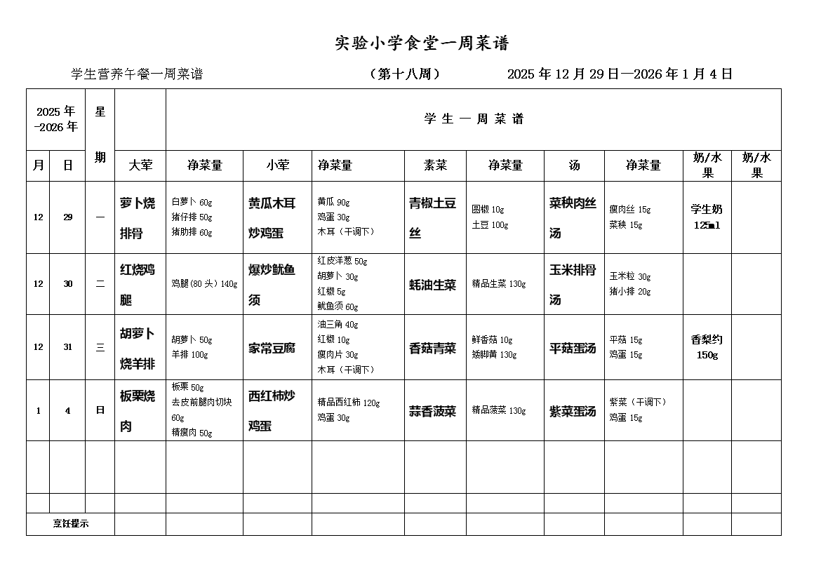 2025-2026学年度第一学期第十八周师生一周菜谱