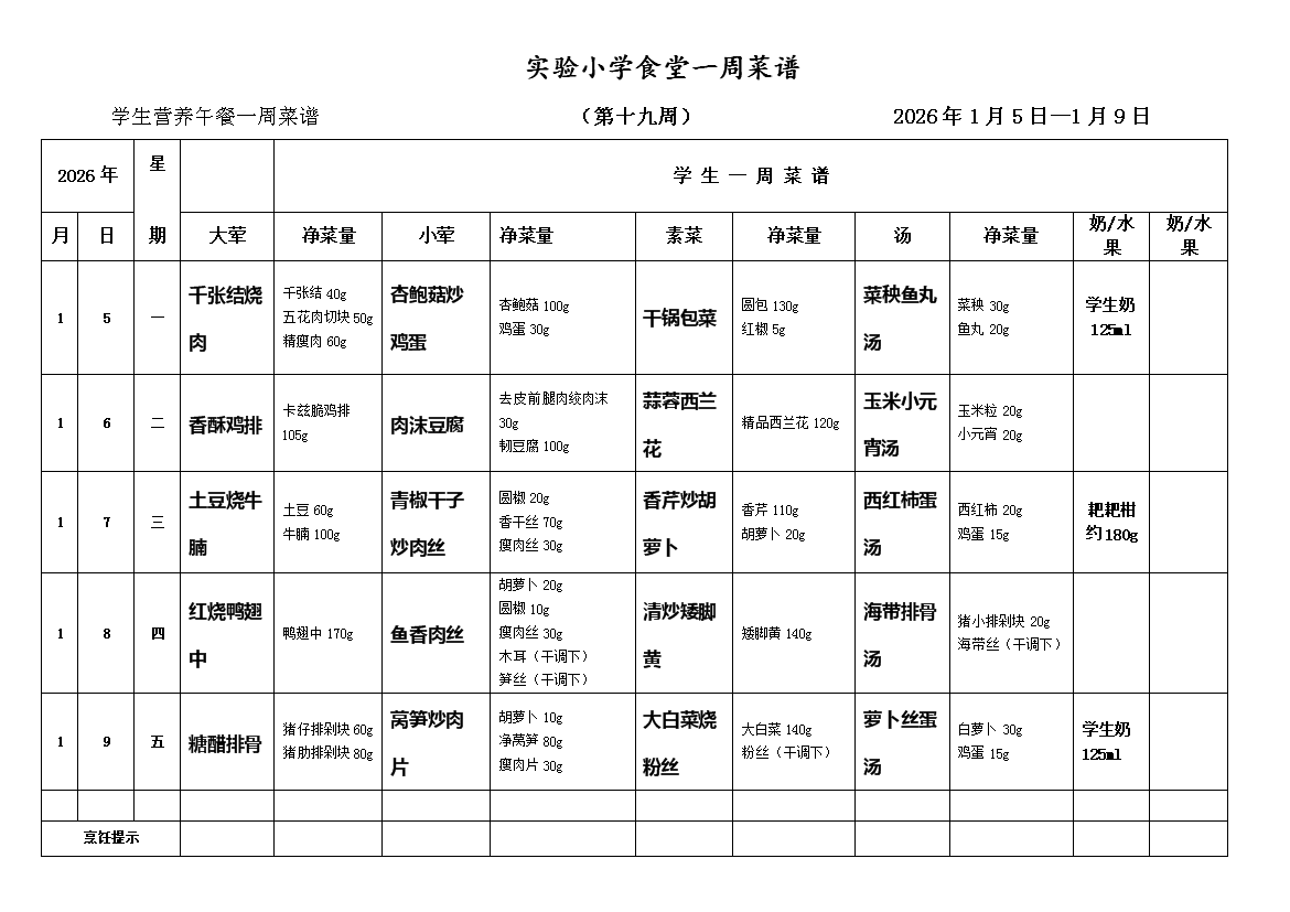 2025-2026学年度第一学期第十九周师生一周菜谱