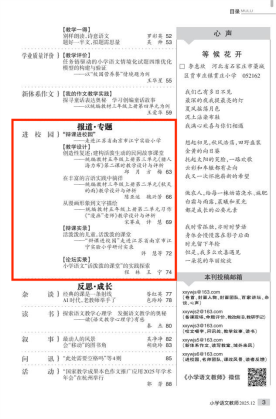 在本期专栏中,我校教师围绕“活泼泼的课堂”主题,集中呈现了多篇蕴含实践智慧与理论深度的教学成果。其中,邱月、方梅老师以《猎人海力布》为例,撰写了《创造性复述:建构活泼生动的民间故事课堂》,紧扣民间故事特点与单元语文要素,搭建学习支架,让古老故事在儿童口中“活泼泼”传承。陈亚运、魏兴芳老师聚焦《秋天的雨》,通过《在丰富的言语实践中徜徉》展现多层次言语实践活动,营造鲜活学习场景。宋赛成、许慧老师针对习作《“漫画”老师》撰写《从漫画形象到文字描绘》,设计递进式习作支架,助力学生顺利实现从图像到文字的跨越。专栏还收录了由杨文华主编、程林书记、王宁校长、许慧老师等共同参与的“辩课实录”。程林书记、王宁校长撰写的《小学语文“活泼泼的课堂”的实践探索》,系统阐述了我校在这一领域的思考与实践。该刊物还在封二对学校辩课活动进行了图文报道。