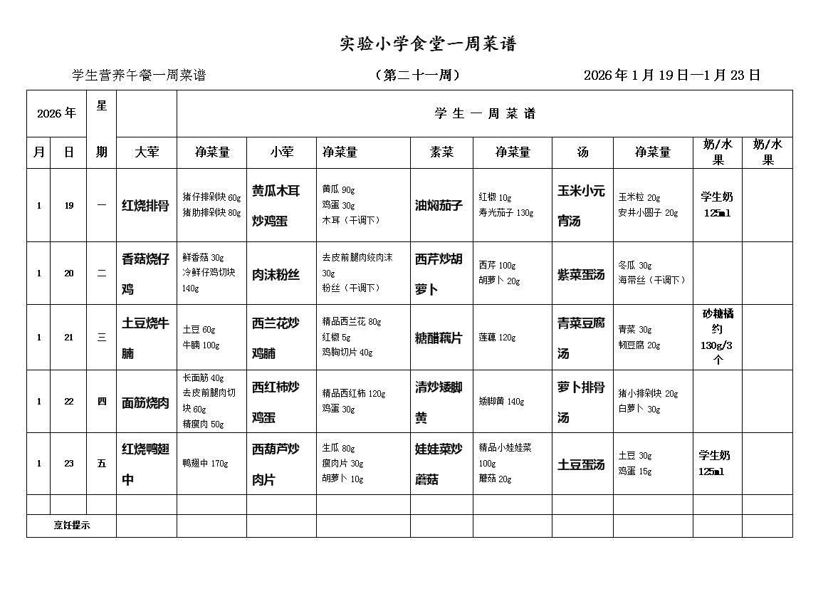 2025-2026学年度第一学期第二十一周师生一周菜谱