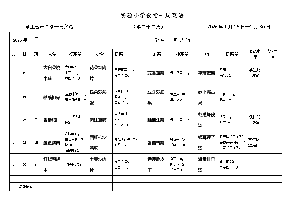 2025-2026学年度第一学期第二十二周师生一周菜谱