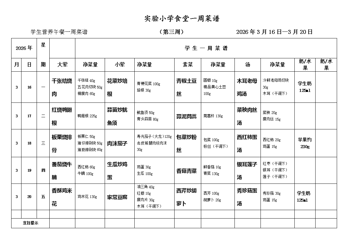 2025-2026学年度第二学期第三周师生一周菜谱